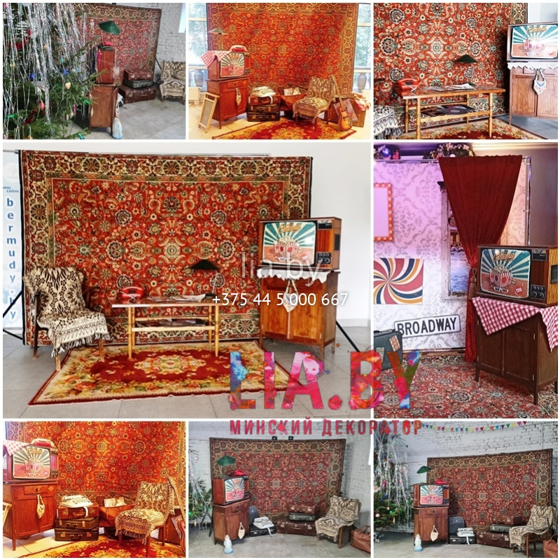 - ретро-утварь: солнечный зонт, граммофон. печатная машинка, сундуки и чемоданы, утюги, керосиновые лампы, швейная машина и другое (наличие уточнять)