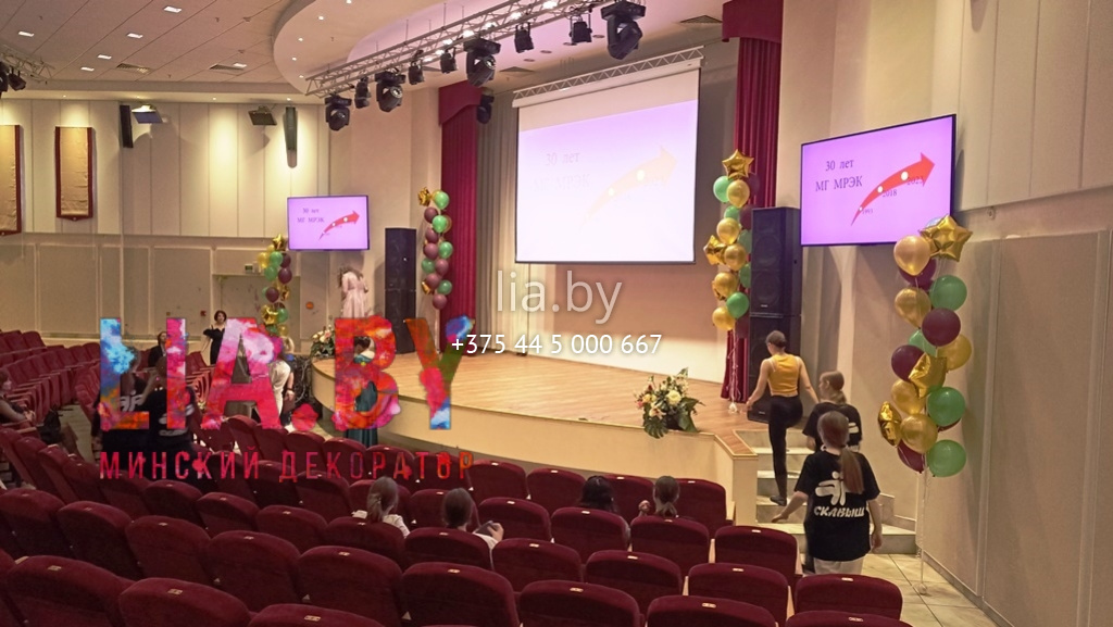 Профессиональный праздник на Минском мясокомбинате, украшение актового зала шарами с гелием